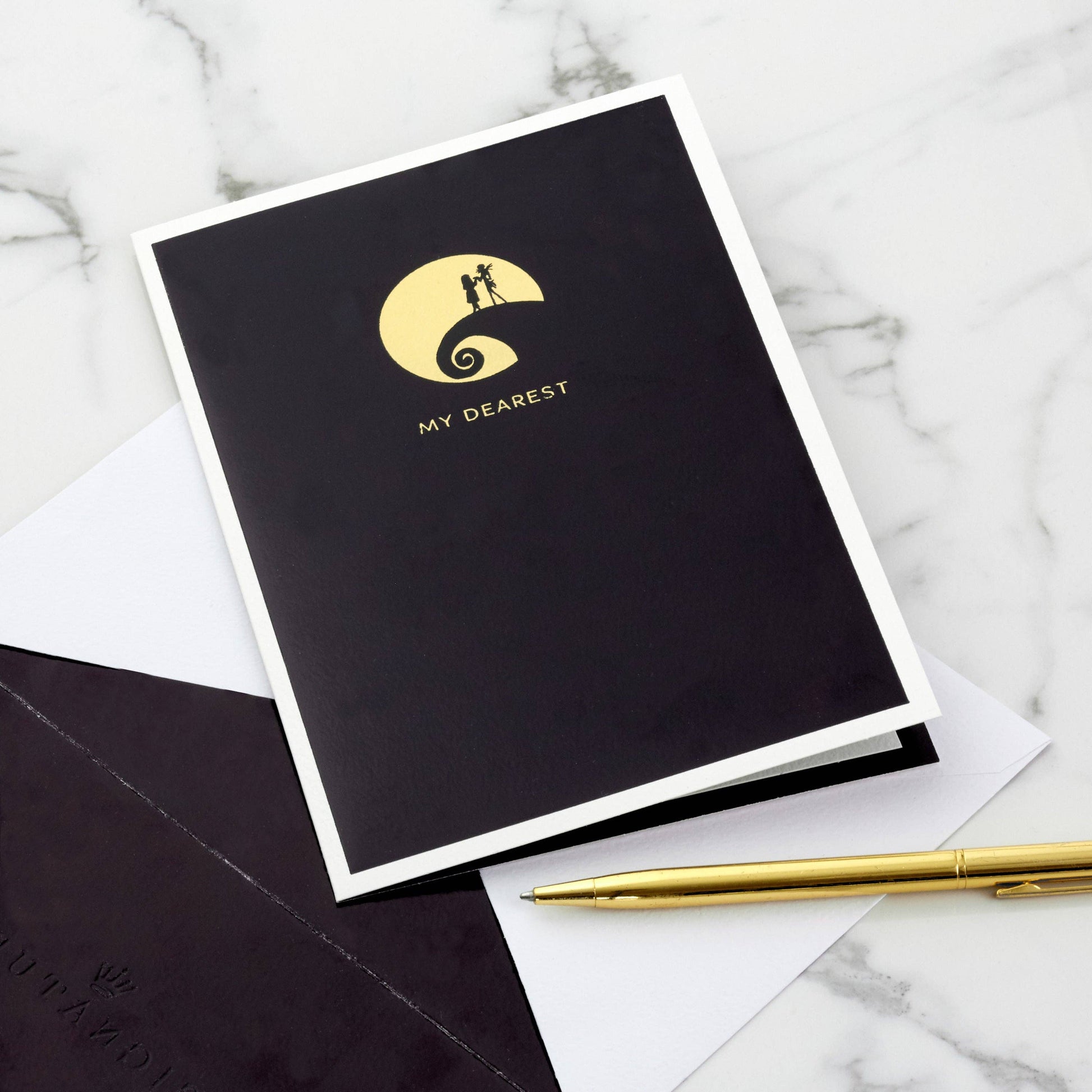 Printed on high-quality board, this card pops-up into a 3D diorama of Jack Skellington and Sally sat in the graveyard with a cat, bats and the moon in the background. This card features black foil details, the message 'My dearest' on the front, and comes complete with a Hallmark branded, white envelope with a black foil lining.