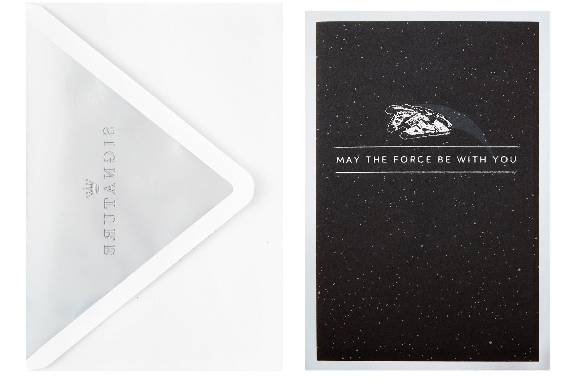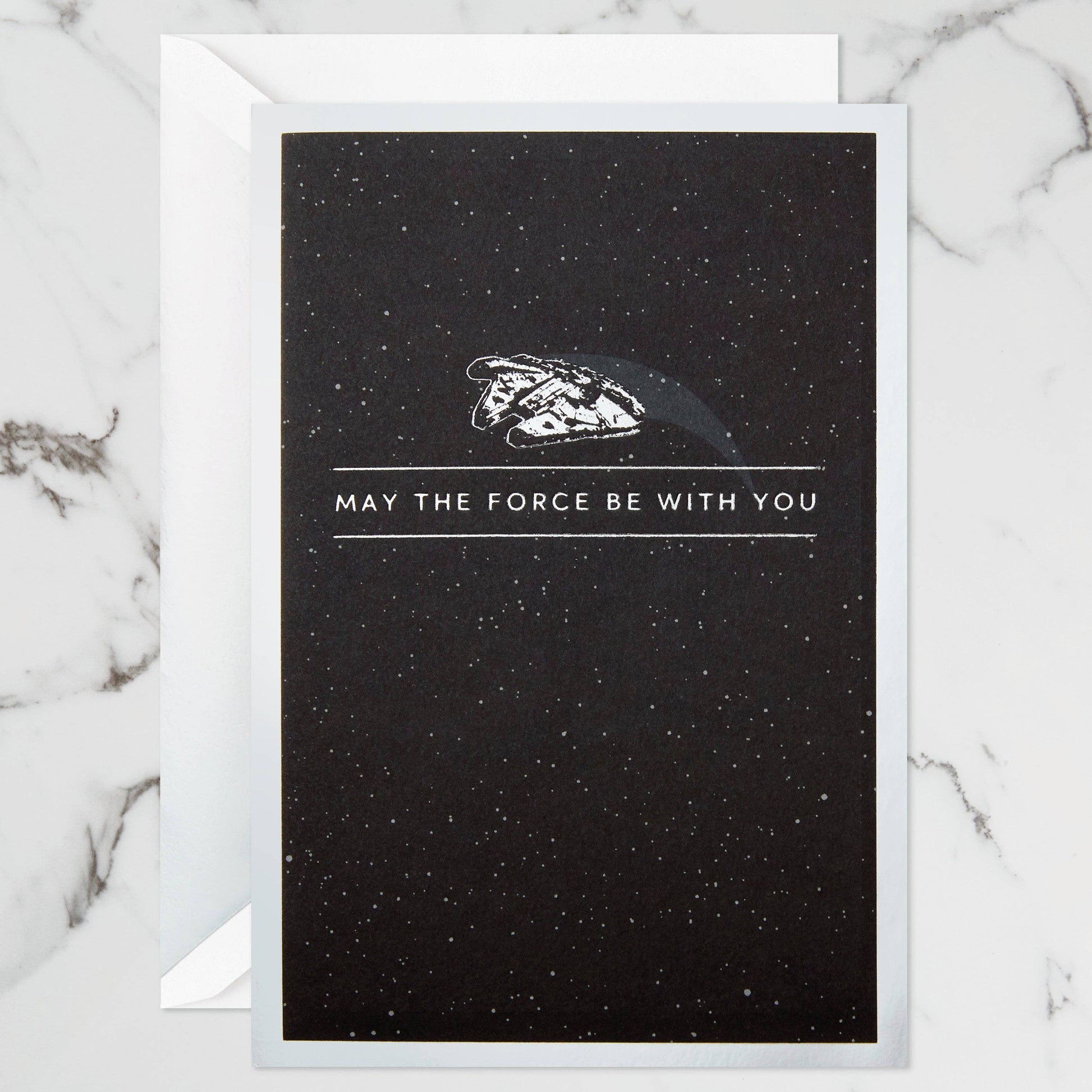 Printed on high-quality board, this card opens up to reveal a pop-up and 3D Star Wars™ Millennium Falcon flying through the galaxy, features silver metallic foil details, a laser cut design, the message 'May the force be with you' on the front, and comes complete with a co-ordinating Hallmark Signature branded, White envelope with silver foil details.